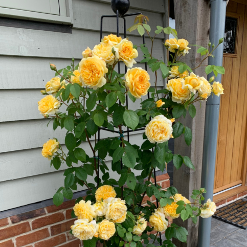 Bring Me Sunshine® (Ausernie) epitomises warmth and elegance in any garden. This remarkable variety, launched in 2022, is favoured for its versatility, health, and cheerful colour. Its deeply filled, cupped rosette blooms in rich sunset orange-yellow gradually transition to lighter apricot tones, offering an ever-changing display of colour. Bring Me Sunshine® has a medium-strong myrrh fragrance, making it a sensory delight. As a shrub it can be pruned to 4ft or trained as a climber, reaching up to approximately 8 ft, adding flexibility to its use in various garden designs. Here, we explore three ways to incorporate Bring Me Sunshine® into your garden. .