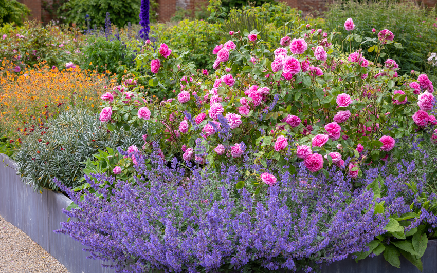 The shrub rose is ideal for growing in a pot or container to brighten up a patio. It also works as a great focal point in a mixed bed paired with purple companion plants.