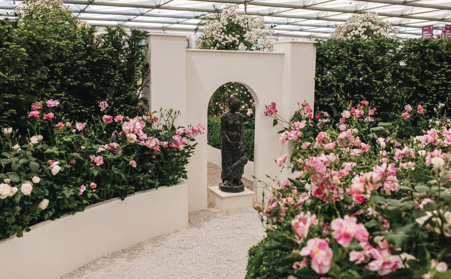Just beyond the arches, a tidy hedge of Queen of Sweden® encircles the whole garden. With her upright habit and blush-pink blooms, she brings a sense of quiet enclosure - a final soft frame that holds everything together.