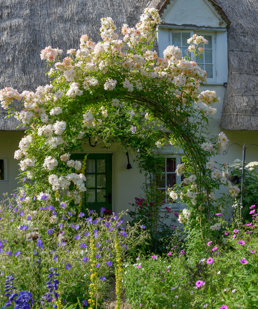 Create a cottage style garden with a painted wooden arch, there is no need to be too formal. Arches allow roses to span areas where there is high traffic, as well as those that are not suitable for planting below.