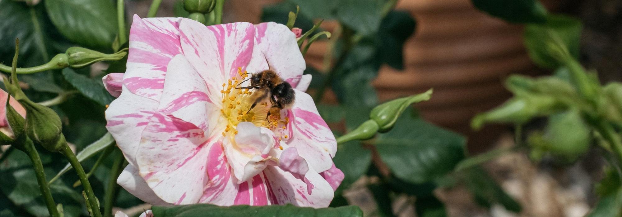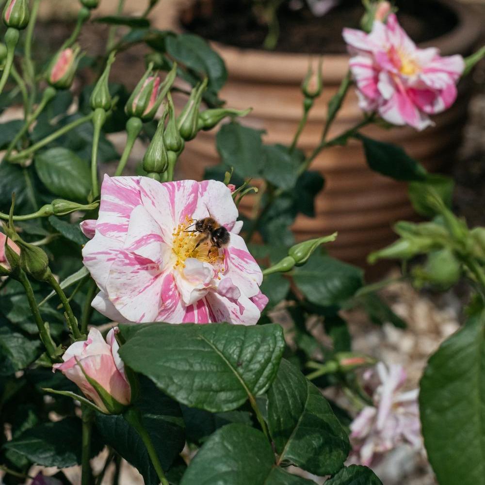 More recently, The King’s Rose® (Ausa27a16) has been planted on the terrace, where its delicate striped petals and open centre complement the surrounding planting while supporting the garden’s ethos. Beautifully scented and welcoming to pollinators, it stands as a quiet emblem of enduring values: beauty, biodiversity and balance.
