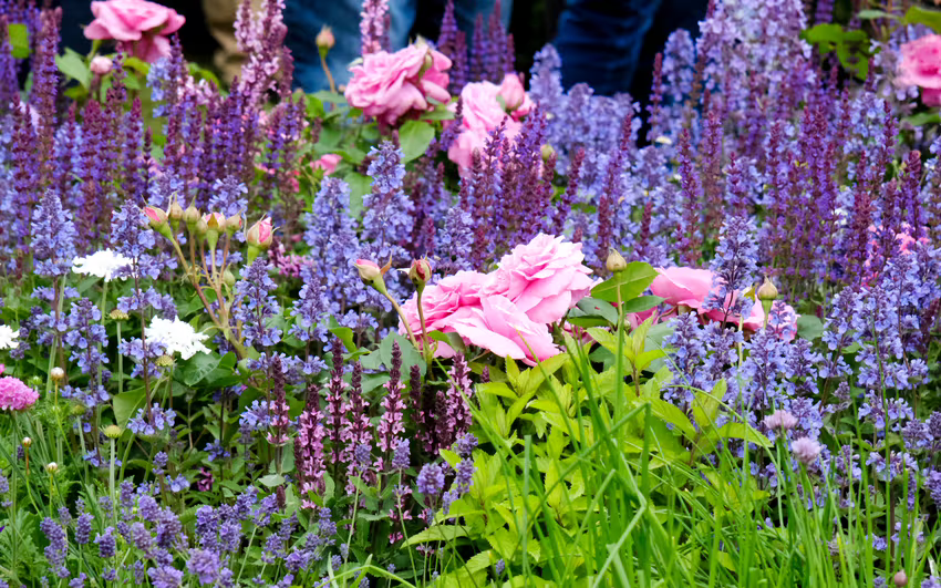 Gertrude Jekyll®(Ausbord) is featured in 'Magic Moment Border garden by Stef Hayden