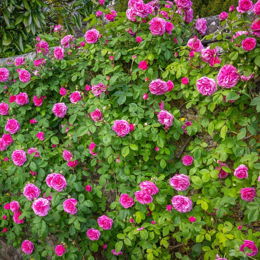 Training climbing roses horizontally along walls, fences, or arches helps create a fuller plant with flowers all along the cane, not just at the tips.