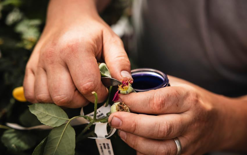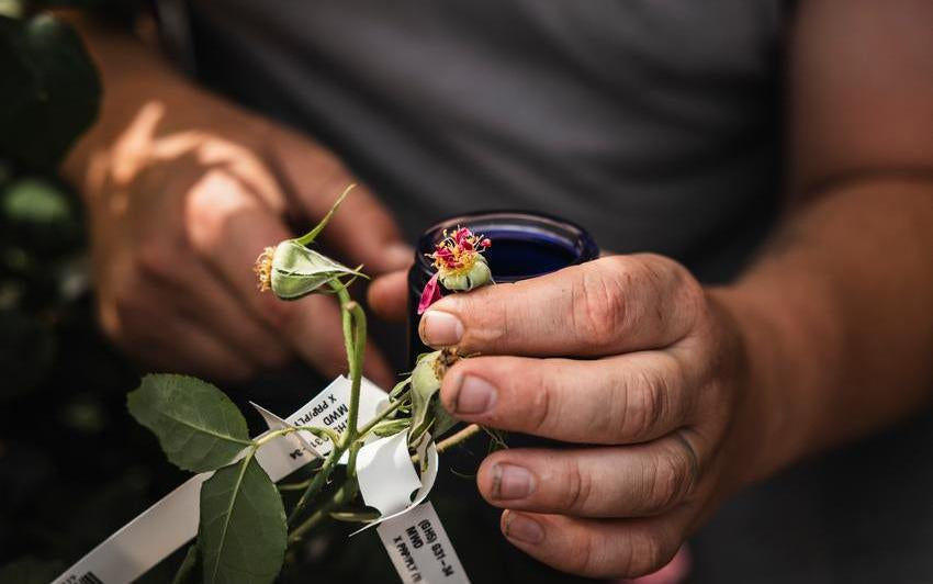 Every rose begins with a pairing. We choose two existing varieties, known as the parents, whose qualities we hope to combine. This choice is guided by experience and intuition. We look for strength, beauty, fragrance, colour, and health, always seeking the potential for something truly special.