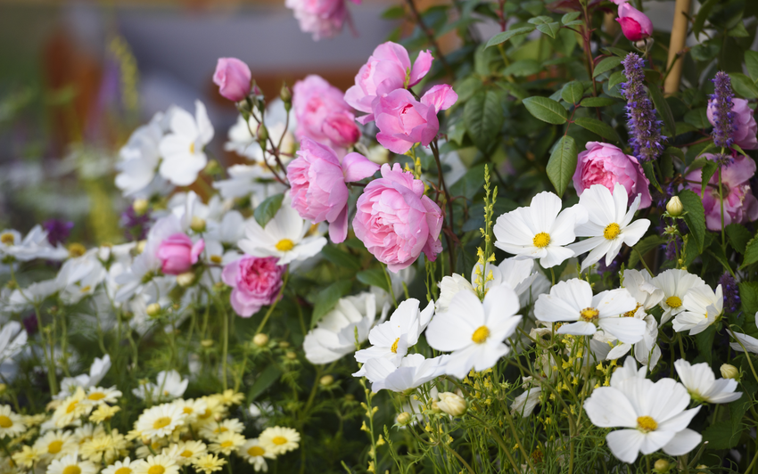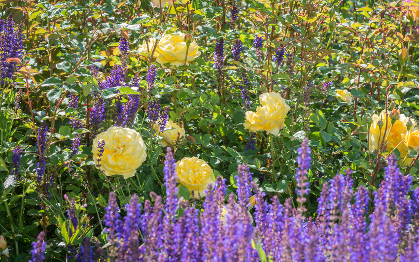 Rosa ‘Penelope Lively®’,Nepeta ‘Six Hills Giant’, Geranium ‘Rozanne’, Salvianemorosa ‘Caradonna’, Alchemillamollis, Eryngiumxzabelii ‘BigBlue’, Origanumlaevigatum ‘Herrenhausen’, Echinaceapallida, Campanulalactiflora ‘LoddonAnna’