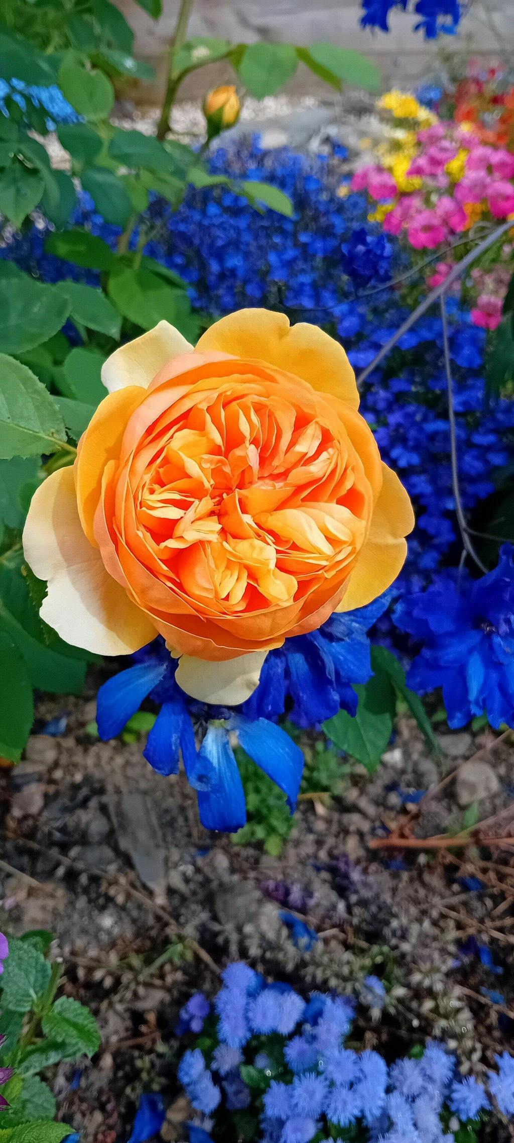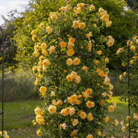 This joyously warm and inviting variety bears deeply filled, cupped rosette blooms of rich sunset orange-yellow that gradually pale to lighter apricot tones over time. This versatile rose can be grown as a climber, reaching up to 8 feet. It is both healthy and vigorous, with a complex, medium-strong Myrrh fragrance that adds an enchanting scent to any garden setting.